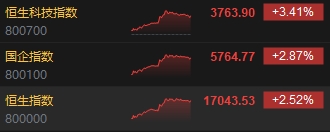 12月28日消息,港股三大指數(shù)高開高走,截至收盤,恒生指數(shù)(17043.529, 418.69, 2.52%)漲2.52%,報17043.53點,恒生科技指數(shù)(3763.9, 124.14, 3.41%)漲3.41%,國企指數(shù)漲2.87%。盤面上,核心科技股齊漲,美團、京東漲超5%,快手漲近4%,網(wǎng)易、百度漲超3%,小米集團微跌;內(nèi)房股漲幅居前,龍光集團(0.62, 0.05, 8.77%)、旭輝控股集團(0.255, 0.02, 8.05%)漲超8%;汽車股漲幅明顯,吉利汽車(8.45, 0.53, 6.69%)漲超6%領(lǐng)銜;內(nèi)險股集體上漲,中國平安(35.25, 1.90, 5.70%)漲近6%;旅游股全天強勢,中國中免(76.35, 7.60, 11.05%)漲超12%。