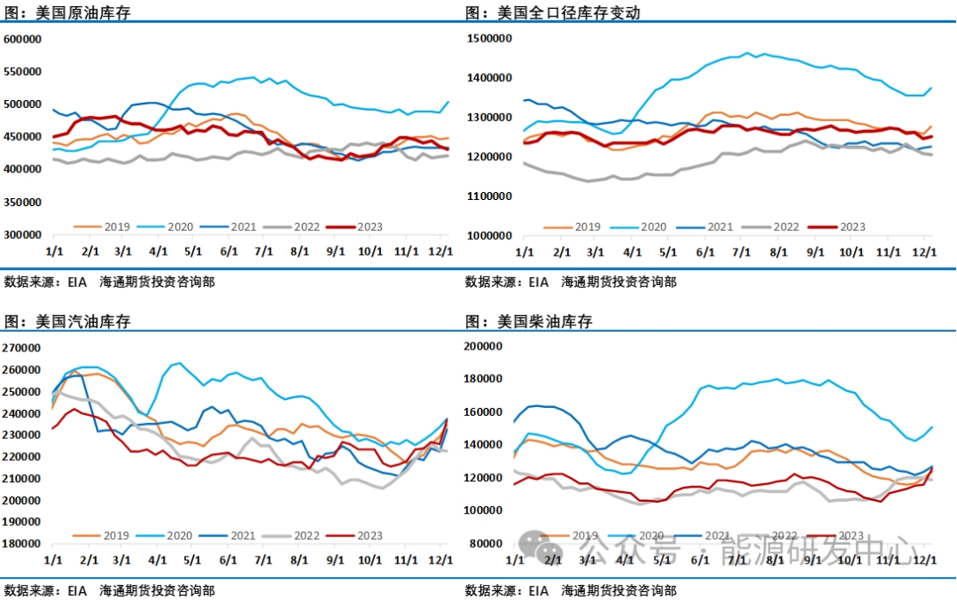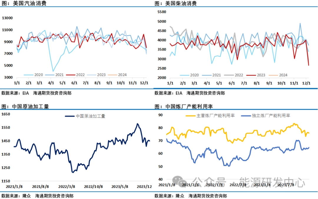 美國(guó)能源信息署(EIA)周四發(fā)布的周度報(bào)告顯示,上周美國(guó)汽油庫(kù)存增長(zhǎng)1090萬(wàn)桶,達(dá)到2.37億桶,創(chuàng)下1993年5月以來(lái)的最大增幅。而精煉油庫(kù)存同樣大增1009萬(wàn)桶。美國(guó)雙旦假期成品油需求大幅下滑進(jìn)一步給市場(chǎng)提醒,雖然是假期因素,但顯然原油市場(chǎng)需求端拖累了油價(jià)表現(xiàn),在經(jīng)過(guò)了2023年疫情之后的修復(fù)階段之后,全球石油需求增長(zhǎng)將放緩,目前主流機(jī)構(gòu)普遍預(yù)計(jì)2024年石油需求增長(zhǎng)在100-150萬(wàn)桶/日之間。需求端的好消息是中國(guó)商務(wù)部于近日下發(fā)2024年第二批原油非國(guó)營(yíng)貿(mào)易進(jìn)口允許量,配額總量為17901萬(wàn)噸,2024年前兩批進(jìn)口原油配額已下發(fā)18269萬(wàn)噸,多數(shù)企業(yè)全年配額已全部發(fā)放完畢,較2023年實(shí)際執(zhí)行量(不含第一批2000萬(wàn))上漲約0.7%。另外商務(wù)部信息顯示中國(guó)成品油出口2024年成品油出口配額4000萬(wàn)噸以上,超過(guò)2023年的3999萬(wàn)噸,2024年出口配額有兩批,第一批成品油出口配額正式下發(fā),共計(jì)1900萬(wàn)噸,環(huán)比上漲58%,同比上漲0.05%。其中,一般貿(mào)易出口配額總量為1440萬(wàn)噸,加工貿(mào)易出口配額為460萬(wàn)噸;2024年1月中石油、中石化、中海油及中化出口計(jì)劃量出爐,四大主營(yíng)成品油出口計(jì)劃總量為370萬(wàn)噸,較2023年12月增長(zhǎng)135.5萬(wàn)噸,增幅57.91%,同比2023年1月增長(zhǎng)11.2萬(wàn)噸,增幅3.13%。