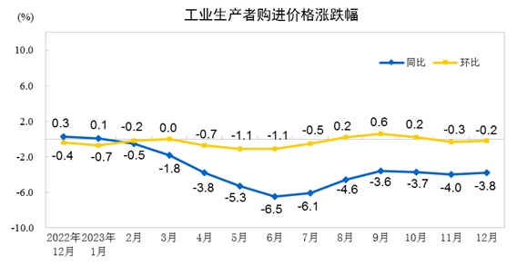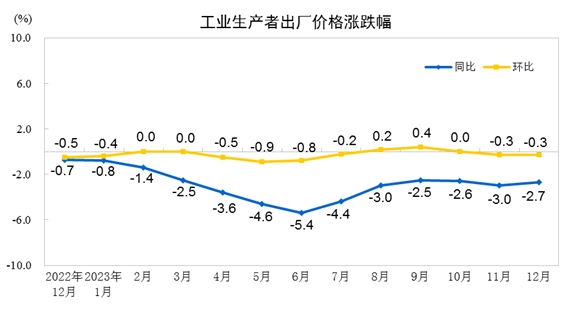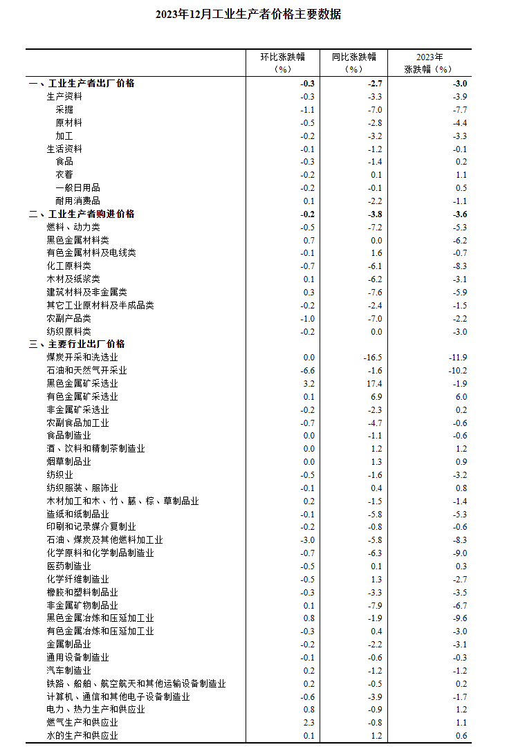 2023年12月份,全國工業(yè)生產(chǎn)者出廠價格同比下降2.7%,環(huán)比下降0.3%;工業(yè)生產(chǎn)者購進價格同比下降3.8%,環(huán)比下降0.2%。2023年全年,工業(yè)生產(chǎn)者出廠價格比上年下降3.0%,工業(yè)生產(chǎn)者購進價格下降3.6%。