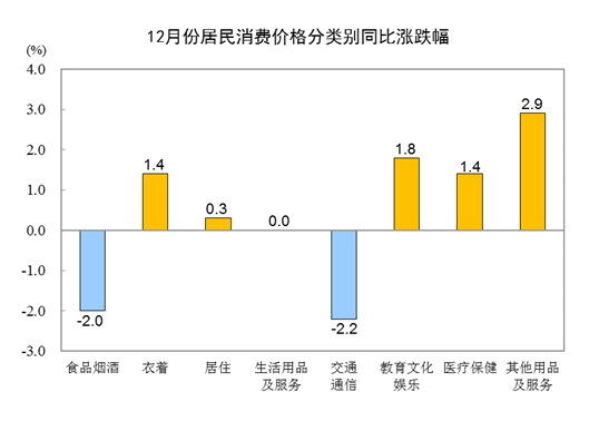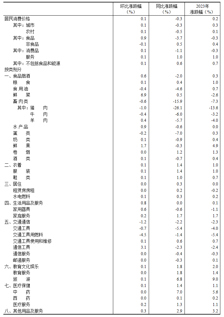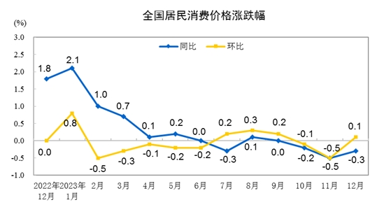 2023年12月份居民消費(fèi)價(jià)格同比下降0.3% 環(huán)比上漲0.1%