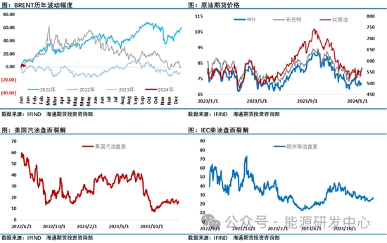 但沖高之后油價(jià)并未守住漲幅,這意味著現(xiàn)階段投資者對(duì)油價(jià)后市預(yù)期并未形成一致觀點(diǎn),多空雙方各執(zhí)一端,這直接導(dǎo)致了油價(jià)在新年之后上演了連續(xù)拉鋸戰(zhàn)。一方面對(duì)于歐佩克+一季度減產(chǎn)行動(dòng)效果仍需時(shí)間驗(yàn)證,歐佩克+核心減產(chǎn)國(guó)均發(fā)表了積極言論試圖提振市場(chǎng)信心, EIA短期能源展望中判斷歐佩克+減產(chǎn)將導(dǎo)致2024年第一季度全球石油庫(kù)存平均減少80萬(wàn)桶/日,雖然從理性角度判斷從歐佩克+各核心減產(chǎn)國(guó)的表態(tài)看會(huì)遵守自愿減產(chǎn)以護(hù)盤油價(jià),投資者對(duì)此有預(yù)期,但押注時(shí)表現(xiàn)謹(jǐn)慎,信心并不足;而近期地緣因素有升溫跡象給油價(jià)注入了溢價(jià),也在一定程度上改善了市場(chǎng)情緒,但總體來(lái)看當(dāng)前原油市場(chǎng)局勢(shì)仍然讓投資者保持了克制,對(duì)于追漲操作仍然謹(jǐn)慎,布倫特沖上80美元之后,缺乏追漲意愿讓油價(jià)難以守住漲幅,油價(jià)最終還是退回到多空相持狀態(tài)。
