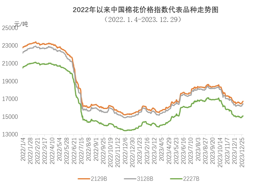 2023年,國內(nèi)棉價(jià)先漲后跌,年初中國棉花價(jià)格指數(shù)(CCIndex3128B)延續(xù)上年底走勢緩慢回升,1月3日全年最低點(diǎn)為15050元/噸。隨著國內(nèi)經(jīng)濟(jì)數(shù)據(jù)表現(xiàn)向好,市場預(yù)期增強(qiáng),原料需求回升,國內(nèi)棉價(jià)持續(xù)上漲,9月4日達(dá)到全年最高點(diǎn)為18433元/噸,隨后受新棉上市、宏觀調(diào)控等多種因素影響,棉價(jià)逐步回落,全年平均價(jià)格為16767元/噸,同比下跌10.8%。