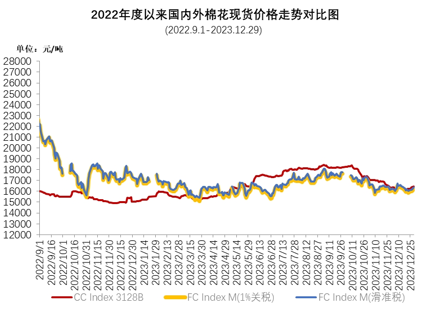 12月,中國棉花價(jià)格指數(shù)(CCIndex3128B)維持震蕩走勢,月均價(jià)較上月下跌。月內(nèi)收購進(jìn)入尾聲,新棉加工量持續(xù)增加,棉花企業(yè)庫存壓力上升,部分企業(yè)下調(diào)報(bào)價(jià)進(jìn)行銷售。紡織企業(yè)受節(jié)前備貨及外銷訂單帶動,成品庫存銷售加快,但生產(chǎn)利潤持續(xù)不佳,且仍有儲備棉庫存,原料采購以隨用隨買或剛需補(bǔ)庫為主,成交情況較上月有改善。12月29日,中國棉花價(jià)格指數(shù)(CCIndex3128B)收于16462元/噸,環(huán)比上漲129元;月均價(jià)為16278元/噸,環(huán)比下跌548元,同比上漲1308元。