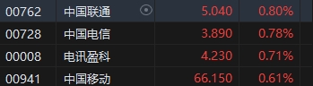 電訊服務(wù)板塊逆勢(shì)上漲,中國(guó)聯(lián)通、中國(guó)電信漲近1%。摩通指,去年中國(guó)電信商表現(xiàn)一直跑贏同期恒指40%以上,認(rèn)為投資者今年將繼續(xù)看好電信股,因?yàn)樵趧?dòng)蕩的市況中更具防守性,而且股息回報(bào)吸引,重申中國(guó)移動(dòng)(66.15, 0.00, 0.00%)為行業(yè)首選,維持“增持”評(píng)級(jí),目標(biāo)價(jià)74.5港元。
