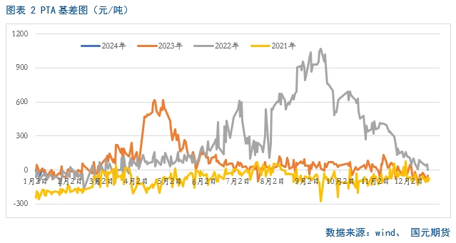 上周PTA 2405合約價格于周一下破均線系統(tǒng),之后在5700一線受到支撐企穩(wěn),主要下游聚酯略有減產(chǎn),但尚未對原料形成拖累。但上游由于地緣政治的影響,價格波動加大,因此上周PTA市場交易的主要邏輯是跟隨成本端波動。步入本周,PTA加工費(fèi)持續(xù)壓縮,而16日福海創(chuàng)裝置開工降負(fù),導(dǎo)致價格略有修復(fù)。從基差上來看,近期基差較上周來看略有縮小,截至1月15日,PTA價差縮小至-32,但相比2022年和2023年同期來看,略有擴(kuò)大,從基差趨勢上來看,一季度基差存在擴(kuò)大的預(yù)期。