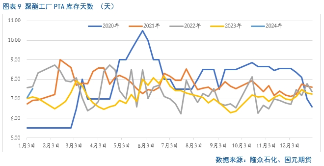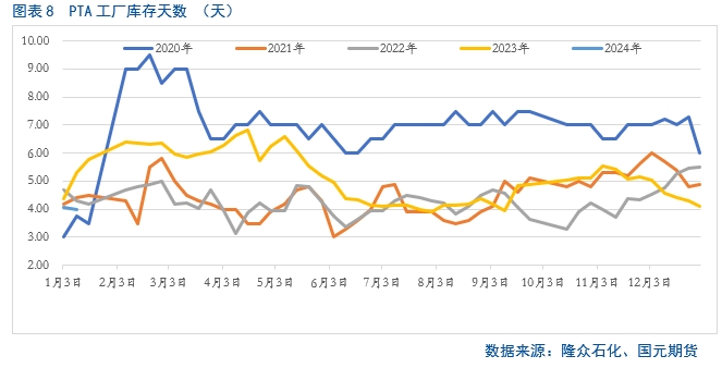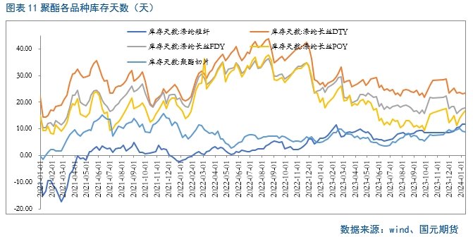 元旦過后,下游聚酯市場已開啟補(bǔ)庫模式,疊加之前廠家?guī)齑嫜永m(xù)低位,導(dǎo)致PTA工廠庫存處于近幾年相對低位。截至1月11日,國內(nèi)PTA工廠庫存在3.98天,較上周下滑0.07天,較去年同期下滑1.33天。不過當(dāng)前市場并不缺貨,工廠庫存相對穩(wěn)定。反觀聚酯工廠,PTA原料庫存截至上周四達(dá)到7.53天,較前一周上漲0.47天,較去年同期增加0.43天?,F(xiàn)貨買盤較少,補(bǔ)貨多為剛需。