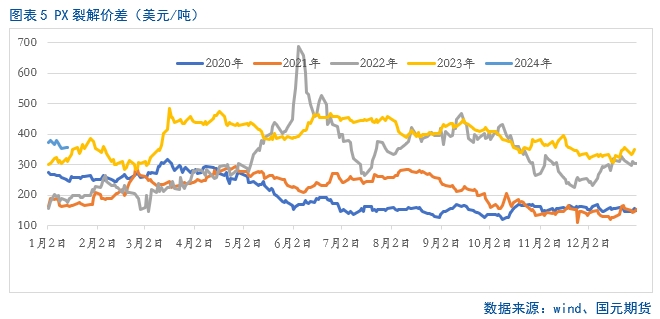 上周隨著前期停車檢修的裝置重啟,國內(nèi)PX裝置開工率大幅上漲,市場供應(yīng)增加。據(jù)統(tǒng)計,截至1月11日,國內(nèi)PX裝置開工率達(dá)到84.56%,較前一周上漲4.18個百分點(diǎn),達(dá)到近1個月以來的新高,主要是廣東石化260萬噸的裝置以及恒逸文萊150萬的裝置重啟,在國內(nèi)裝置開工率提升的背景下,亞洲裝置開工率也較前一周上漲了4.95個百分點(diǎn)至77.93%。伴隨著國內(nèi)供應(yīng)量的上漲, PX裂解價差呈現(xiàn)小幅收縮。截至上周五,PX裂解價差降至356美元/噸,較節(jié)后第一天下滑4.65個百分點(diǎn),達(dá)到開年以來的相對低位,不過由于下游PTA在一季度有投產(chǎn)的預(yù)期,因此對PX的支撐仍在,導(dǎo)致當(dāng)前的PX裂解價差遠(yuǎn)高于近四年同期。
