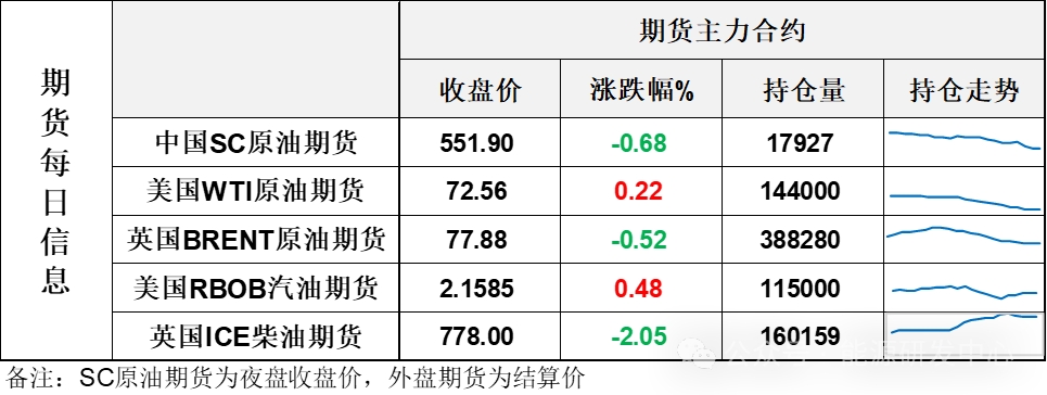 【1】WTI主力原油期貨收漲0.16美元,漲幅0.22%,報72.56美元/桶;布倫特主力原油期貨收跌0.41美元,跌幅0.52%,報77.88美元/桶;INE原油期貨收跌0.68%,報551.9元。