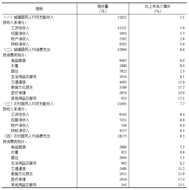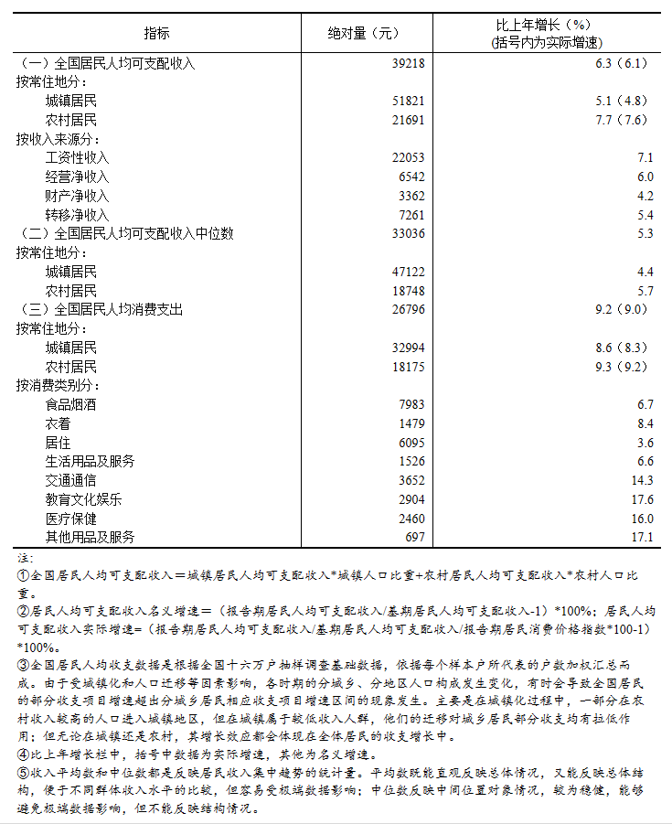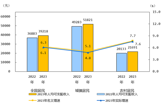 2023年,全國居民人均可支配收入39218元,比上年名義增長6.3%,扣除價格因素,實際增長6.1%。分城鄉(xiāng)看,城鎮(zhèn)居民人均可支配收入51821元,增長(以下如無特別說明,均為同比名義增長)5.1%,扣除價格因素,實際增長4.8%;農(nóng)村居民人均可支配收入21691元,增長7.7%,扣除價格因素,實際增長7.6%。