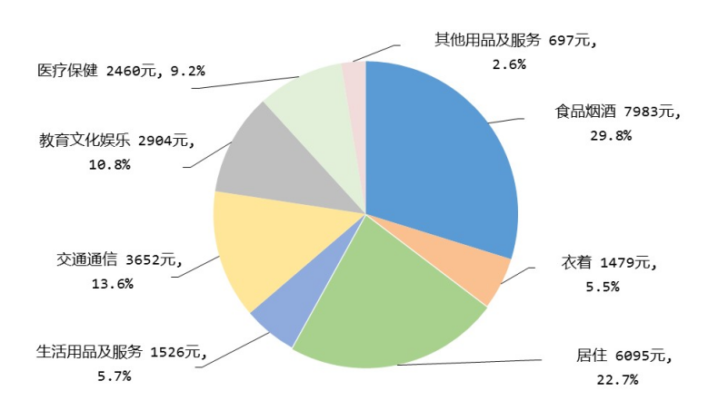2023年,全國居民人均食品煙酒消費支出7983元,增長6.7%,占人均消費支出的比重為29.8%;人均衣著消費支出1479元,增長8.4%,占人均消費支出的比重為5.5%;人均居住消費支出6095元,增長3.6%,占人均消費支出的比重為22.7%;人均生活用品及服務(wù)消費支出1526元,增長6.6%,占人均消費支出的比重為5.7%;人均交通通信消費支出3652元,增長14.3%,占人均消費支出的比重為13.6%;人均教育文化娛樂消費支出2904元,增長17.6%,占人均消費支出的比重為10.8%;人均醫(yī)療保健消費支出2460元,增長16.0%,占人均消費支出的比重為9.2%;人均其他用品及服務(wù)消費支出697元,增長17.1%,占人均消費支出的比重為2.6%。