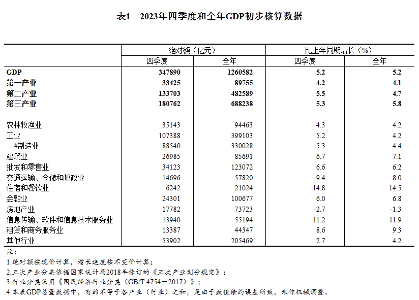 根據(jù)有關(guān)基礎(chǔ)資料和國(guó)內(nèi)生產(chǎn)總值(GDP)核算方法,經(jīng)初步核算,我國(guó)2023年四季度和全年GDP核算結(jié)果如下。