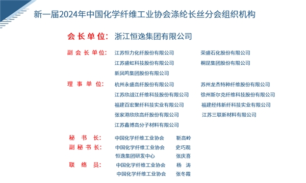 根據(jù)各成員企業(yè)對(duì)征詢函的反饋意見(jiàn)及現(xiàn)場(chǎng)參加會(huì)議會(huì)員單位代表舉手表決,將中國(guó)化學(xué)纖維工業(yè)協(xié)會(huì)滌綸長(zhǎng)絲專業(yè)委員會(huì)”改制為“中國(guó)化學(xué)纖維工業(yè)協(xié)會(huì)滌綸長(zhǎng)絲分會(huì)”,分會(huì)會(huì)長(zhǎng)實(shí)行輪值制,同時(shí)選舉出了新一屆中國(guó)化學(xué)纖維工業(yè)協(xié)會(huì)滌綸長(zhǎng)絲分會(huì)組織機(jī)構(gòu),其中,浙江恒逸集團(tuán)有限公司當(dāng)選為新一屆會(huì)長(zhǎng)單位,江蘇恒力化纖股份有限公司、榮盛石化股份有限公司、江蘇盛虹科技股份有限公司、桐昆集團(tuán)股份有限公司、新鳳鳴集團(tuán)股份有限公司擔(dān)任副會(huì)長(zhǎng)單位,杭州永盛高纖股份有限公司、蘇州龍杰特種纖維股份有限公司、江蘇三聯(lián)新材料有限公司等擔(dān)任理事單位,中國(guó)化學(xué)纖維工業(yè)協(xié)會(huì)靳高嶺當(dāng)選為秘書長(zhǎng),中國(guó)化學(xué)纖維工業(yè)協(xié)會(huì)華東辦事處副主任史巧觀、恒逸集團(tuán)張慶喜當(dāng)選為副秘書長(zhǎng)。