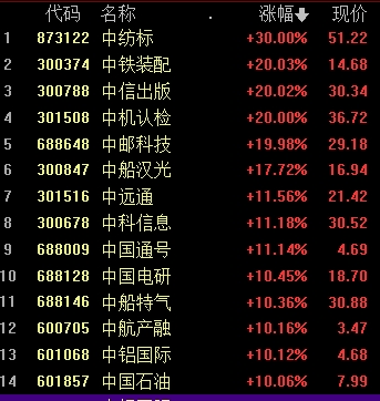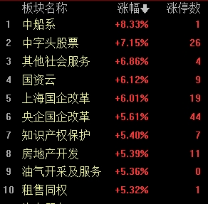 盤面上,各板塊普漲,中字頭股票、上海國企改革、國資云、房地產(chǎn)開發(fā)板塊漲幅居前。