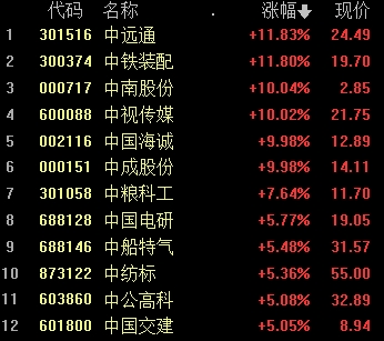 中遠(yuǎn)通(24.490, 0.00, 0.00%)、中郵科技(28.130, 0.00, 0.00%)、中視傳媒、中國海誠、中南股份等走強。