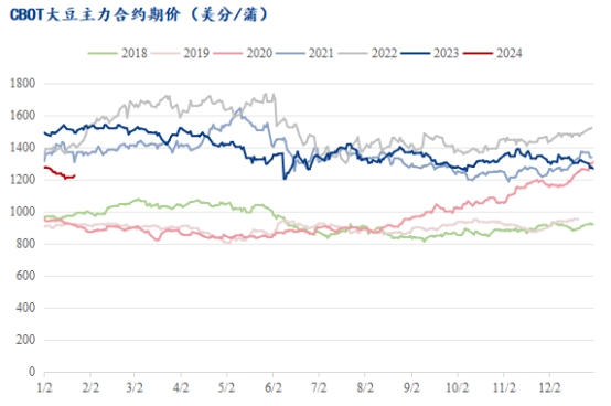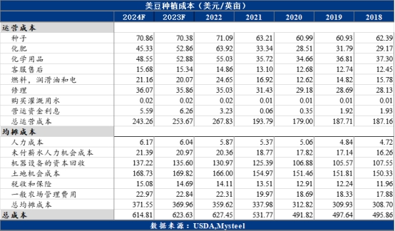 2020年12月下旬,美豆期價觸及1200分/蒲的年度高位,自此之后便開始了大豆高價時代。從上圖我們可以看到自2021年-2023年美豆期價都在1200美分/蒲之上,2022年大豆價格運行區(qū)間更是上移至1300美分/蒲-1750美分/蒲。雖然此時間段有如地緣政治沖突,宏觀經(jīng)濟,天氣等擾動因素影響了大豆期價的短期走勢,但最終還是需要回歸基本面。而大豆的種植成本就是大豆價格的關(guān)鍵影響因素之一,構(gòu)成大豆的定價中樞。