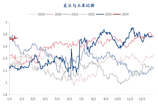 盡管美豆種植收益縮水,但是相較于種植美玉米還是有利可圖。由于美國大豆及玉米種植區(qū)域較為重疊,因此兩者存在“爭地效應(yīng)”即在不開拓新的種植區(qū)域的情況下,其中一方的種植面積增加意味著另一方的種植面積將會減少。通常市場會關(guān)注美豆11月合約和美玉米12月合約的比值來比較新季大豆和玉米的種植偏好,一般在2.5以上的時候可能更偏好于種植大豆,在2.3以下更偏好于種植玉米。從美豆于玉米的比值來看,2024年度美國農(nóng)民會更傾向于多種大豆。