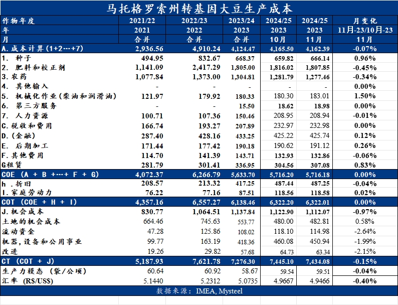 巴西大豆種植成本增加,以巴西頭號主產(chǎn)州馬托格羅索州為例,根據(jù)IMEA的數(shù)據(jù)顯示其2023/24年度的轉(zhuǎn)基因大豆種植成本為7276.37雷亞爾/公頃.如果將巴西種植成本按照美國標準進行換算:2023 年馬州大豆種植平均成本 ,雷亞爾對美元的匯率按照 5.0計算,單產(chǎn)按照 3.5噸/公頃,則馬州當前成本預(yù)估為433.3美元/噸,或者 1174.3美分/蒲式耳。巴西農(nóng)民按照當前 CBOT 大豆價格計算,依然有獲利空間。因此,巴西農(nóng)民繼續(xù)擴大大豆種植面積的激勵較強。