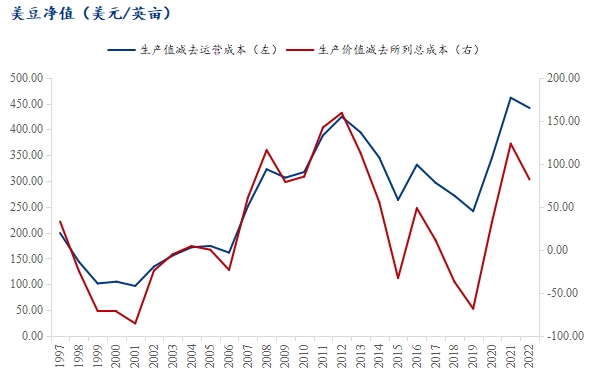 2024年的大豆種植成本或雖有小幅下降,但是種植利潤卻在繼續(xù)縮水。主要原因就是大豆價格高企帶來的高種植利潤推動種植面積的擴張,隨之帶來的產(chǎn)量上漲反作用于大豆價格。衡量美國大豆種植收益的兩個指標:“收入減去營運成本”(左軸)主要反映自有土地農(nóng)民的收益情況,“收入減去在列的總成本”(右軸),反映的是租地種植的收益情況。