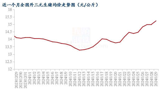 據(jù)Mysteel數(shù)據(jù)監(jiān)測,截至1月29日,全國外三元生豬出欄均價為15.24元/公斤,較昨日上漲0.23元/公斤。全國豬價南北齊漲,僅華南小幅走弱。春節(jié)將近,終端拉開備貨序幕,東北外調(diào)積極,中北部養(yǎng)殖端走貨加快,東南部雨雪天氣對市場情緒及消費增長預(yù)期刺激作用明顯,農(nóng)村、鄉(xiāng)鎮(zhèn)消費增量,終端市場成交情況好轉(zhuǎn)。短期行情在市場情緒及需求增量影響下或繼續(xù)上漲。