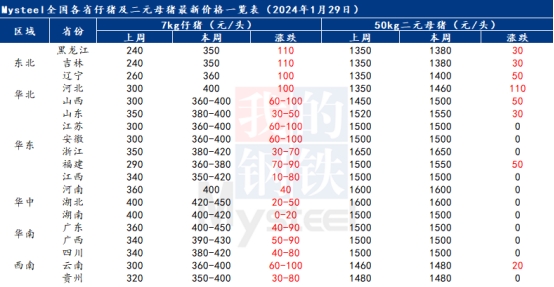 據(jù)Mysteel最新調(diào)研,截至1月29日,當前7Kg仔豬主流市場價在350-450元/頭,部分高報價接近500元/頭。前期華中、華東、華北受豬病影響較為嚴重的省份看好24年下半年行情,市場補欄積極性提升;而北方仔豬外銷量有限,多從南方采購優(yōu)質(zhì)仔豬苗,仔豬開啟南豬北調(diào),仔豬價格順勢漲價;北方低價區(qū)補漲,漲幅較為明顯。且臨近年底,仔豬交易時間有限,年后市場恢復(fù)正常交易流通后,預(yù)計年后3-4月7kg仔豬價格或超500元/頭。短期仔豬行情仍偏強運行,價格或續(xù)漲。