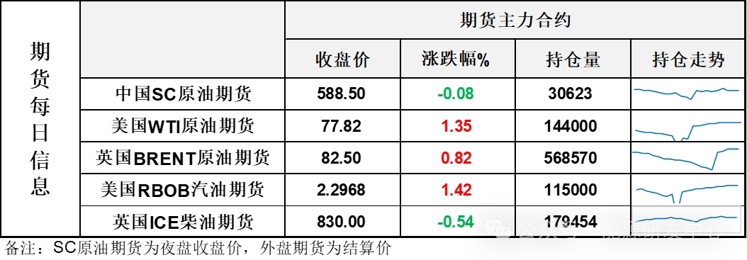 【1】WTI主力原油期貨收漲1.04美元,漲幅1.35%,報77.82美元/桶;布倫特主力原油期貨收漲0.67美元,漲幅0.82%,報82.5美元/桶;INE原油期貨收跌0.08%,報588.5元。