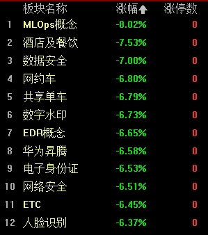 盤面上,各板塊普跌,酒店旅游、數(shù)據(jù)安全、華為昇騰、衛(wèi)星導(dǎo)航等板塊跌幅居前。