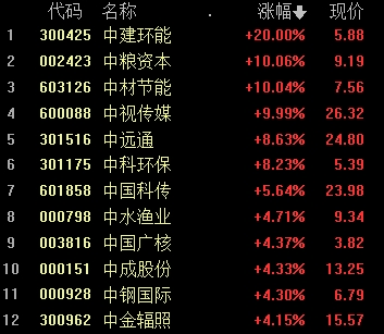 中視傳媒、中材節(jié)能、中航電測(36.830, 0.46, 1.26%)、中糧糖業(yè)(8.490, 0.03, 0.35%)、中國出版(7.500, -0.40, -5.06%)等走強(qiáng)。