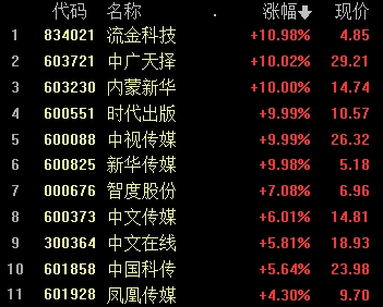 中文在線(19.200, 0.27, 1.43%)、中廣天擇(28.020, -1.19, -4.07%)、川網(wǎng)傳媒(14.950, -0.41, -2.67%)、粵傳媒(3.990, -0.28, -6.56%)(維權(quán))、引力傳媒(15.170, -0.16, -1.04%)等多股活躍。