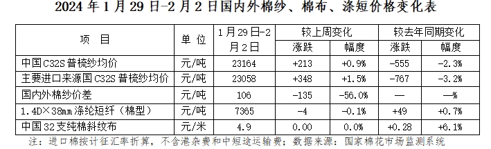本周(2024年1月29日-2月2日),國(guó)內(nèi)棉花期現(xiàn)貨價(jià)格微漲,棉紗價(jià)格上漲;國(guó)際棉花價(jià)格上漲;國(guó)內(nèi)滌綸短纖價(jià)格微漲。