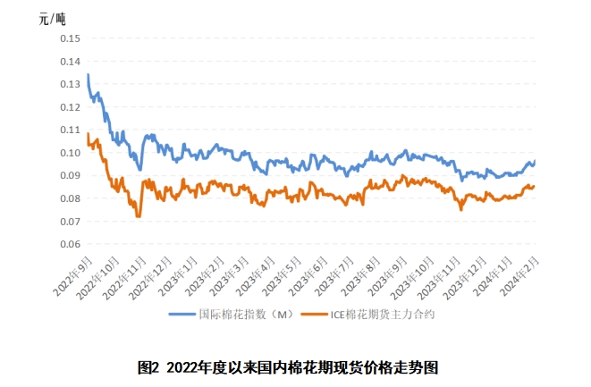 軋花廠(chǎng)陸續(xù)放假,棉花收購(gòu)基本結(jié)束,現(xiàn)貨價(jià)格慣性上漲(圖1)。期貨市場(chǎng)方面,自2024年1月29日以當(dāng)日最高價(jià)16126元/噸收盤(pán),當(dāng)天價(jià)格上漲未伴有成交量放大,隨后幾天呈現(xiàn)出上漲動(dòng)力不足,收盤(pán)價(jià)逐步下降,但均價(jià)仍高于上周。1月29日-2月2日,鄭州棉花期貨主力合約結(jié)算均價(jià)16042元/噸,較前周上漲64元/噸,漲幅0.4%;代表內(nèi)地標(biāo)準(zhǔn)級(jí)皮棉市場(chǎng)價(jià)格的國(guó)家棉花價(jià)格B指數(shù)均價(jià)16825元/噸,較前周上漲129元/噸,漲幅0.8%。