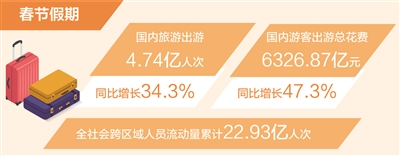 文化和旅游部數(shù)據(jù)中心18日測算,春節(jié)假期國內(nèi)旅游出游4.74億人次,同比增長34.3%,按可比口徑較2019年同期增長19.0%;國內(nèi)游客出游總花費6326.87億元,同比增長47.3%,按可比口徑較2019年同期增長7.7%;入出境旅游約683萬人次,其中出境游約360萬人次,入境游約323萬人次。