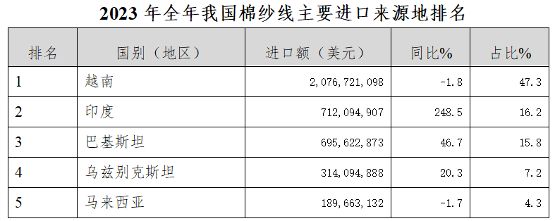 從進(jìn)口來源看,進(jìn)口棉紗的前5大來源地全部來自亞洲地區(qū),前五大來源地合計占比90%。南亞兩國進(jìn)口增長,其余均不同程度下降。越南一直位居我棉紗線進(jìn)口來源地首位,2023年自越南進(jìn)口棉紗線86.5萬噸,同比增長19.1%,占棉紗線進(jìn)口總量42.3%,進(jìn)口金額達(dá)23.6億,同比增1.6%,占進(jìn)口總額的39.5%,占比下降。前三大棉紗進(jìn)口市場中,我國自巴基斯坦進(jìn)口棉紗線增長46.7%,我國對印度進(jìn)口棉紗線大幅增長,增長248.5%。