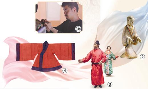 曲裾式長衣,衣襟向右接長成三角,并繞至身后形成繞襟效果,極具秦漢特色。常用花羅、經(jīng)錦、鎖繡等織繡工藝。