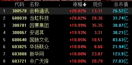 當(dāng)虹科技、因賽集團(tuán)、萬興科技(102.000, -2.95, -2.81%)、新華網(wǎng)等走強(qiáng)。