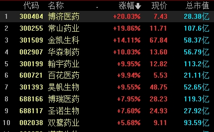 金凱生科(64.060, -3.78, -5.57%)、常山藥業(yè)(11.100, -0.61, -5.21%)、博濟(jì)醫(yī)藥、百花醫(yī)藥等多股活躍。