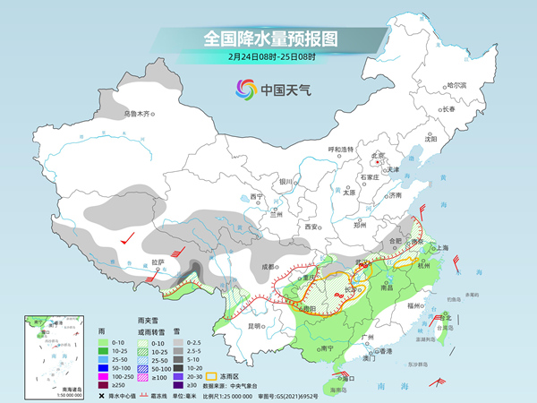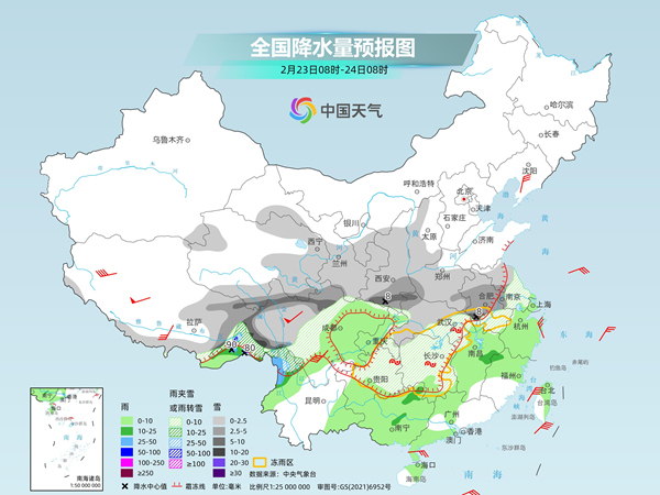 昨天,我國大范圍雨雪天氣持續(xù),部分地區(qū)雨雪相態(tài)復(fù)雜。監(jiān)測顯示,陜西北部、山西北部、山東中南部、河南中部、湖北北部等地部分地區(qū)出現(xiàn)中雪或大雪,山東棗莊和濟寧、河南漯河和駐馬店、湖北襄陽等局地10~19毫米。河南東部、湖北東部和南部、安徽中北部、江蘇北部和西南部、湖南北部等地部分地區(qū)出現(xiàn)雨夾雪5~20毫米,湖北東南部、安徽南部等局地25~56毫米。貴州東部、湖南中北部、湖北東部、安徽中部、江蘇西部等地出現(xiàn)凍雨。上海、浙江中北部、安徽南部、江西北部等地部分地區(qū)出現(xiàn)大到暴雨,浙江衢州、金華,江西南昌、上饒和景德鎮(zhèn)等局地大暴雨。