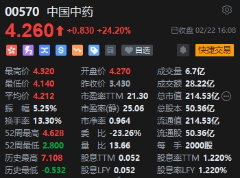 中醫(yī)藥股漲幅居前 ,中國中藥全天漲超24%。2月21日晚間,中國中藥發(fā)布公告,國藥集團建議透過計劃安排的方式,以每股4.6港元現(xiàn)金的價格將中國中藥私有化。國藥集團的報價較中國中藥最新收盤價溢價34.11%,國藥集團私有化建議的總代價約為154.5億港元。中國中藥已向香港聯(lián)交所申請自2月22日上午九時正起恢復股份買賣。