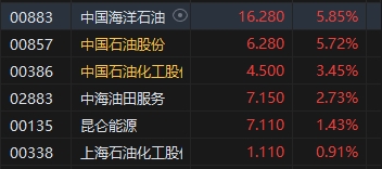 石油股全天大漲,中海油、中石油漲近6%,中海油創(chuàng)歷史新高,中石油創(chuàng)2015年6月以來新高,中石化創(chuàng)去年九月以來新高。首先,從海外因素來看,地緣政治沖突、美聯(lián)儲降息、市場供應緊縮都是導致油價上揚的重要因素。其次,由于美國通脹依然頑固,市場已經(jīng)推遲了美聯(lián)儲何時降息的預期,目前普遍預計首次降息將在6月,而不是3月或 5 月。而較低的利率通常會刺激經(jīng)濟增長,從而刺激原油需求。最后,今日“三桶油”的大漲還受益于國內(nèi)市場“中特估”概念的提振。此前,國資委提出將要把市值管理納入央企負責人考核。近來,市場傳言相關(guān)考核辦法將于近期可能發(fā)布,但目前該消息尚未獲得權(quán)威渠道的確認。