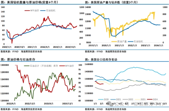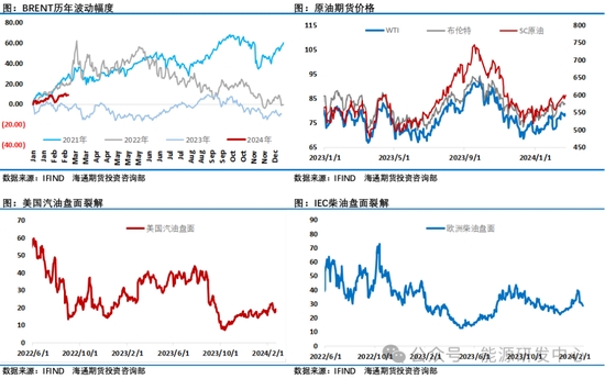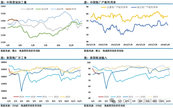 從供應端來看,貝克休斯最新消息美國鉆井公司增加六口石油鉆井,為自去年11月以來最大周增幅。盡管如此美國原油產(chǎn)量在2024年增速將較23年明顯減緩。美國、及南美巴西、圭亞那等國家將成為2024年原油市場主要增量者。歐佩克+減產(chǎn)執(zhí)行背景下,供應端壓力在一季度有所緩解,從目前核心歐佩克+成員國表態(tài)將遵守減產(chǎn)協(xié)議來看,石油輸出國組織維持石油市場穩(wěn)定的態(tài)度仍是非常堅決。目前讓市場猶豫不定的是原油市場需求端,從三大權威機構二月份月報對需求判斷來看,分歧較大,對全球經(jīng)濟增長預期的差異及對能源轉型過程能源需求預期的不同的導致了不同預期。從目前中美二國的煉油開工來看,2月份需求端確實沒有給油價帶來支撐,反而是在過去一段時間成為拖累油價表現(xiàn)的因素,中國在過去一周因為糟糕的極寒天氣延遲了國內(nèi)需求的啟動,積極的是預期隨著糟糕天氣結束后中國市場節(jié)后經(jīng)濟運行重新啟動及美國煉廠逐漸結束檢修煉油量回升。可以預見占全球需求份額超35%的中美需求的啟動會改變之前的疲弱表現(xiàn),這對油價接下來的表現(xiàn)將是一個非常關鍵的影響因素。