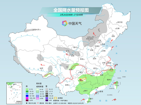 氣象部門提醒,南方大部陰雨頻繁的天氣將延續(xù)至3月初,其中,后天至3月1日,降水又將增強(qiáng),需關(guān)注路面濕滑、能見(jiàn)度下降等對(duì)春運(yùn)出行等方面的不利影響。華北、東北部分地區(qū)今明天將有降雪,公眾雪天外出請(qǐng)留意交通安全。