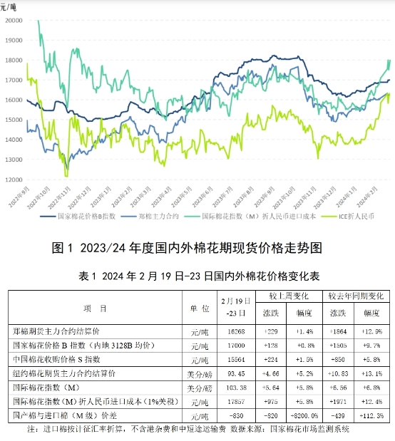 本周(2024年2月19日-23日)棉花期現(xiàn)貨價(jià)格均上漲,且基差擴(kuò)大(圖1)。代表內(nèi)地標(biāo)準(zhǔn)級(jí)皮棉市場(chǎng)價(jià)格的國(guó)家棉花價(jià)格B指數(shù)均價(jià)17000元/噸,較前周上漲128元/噸,漲幅0.8%。代表進(jìn)口棉中國(guó)主港到岸均價(jià)的國(guó)際棉花指數(shù)(M)均價(jià)103.38美分/磅,較前周上漲5.64美分/磅,漲幅5.8%;折人民幣進(jìn)口成本17857元/噸(按1%關(guān)稅計(jì)算,不含港雜和運(yùn)費(fèi)),較前周上漲975元/噸,漲幅5.8%。2月19日-23日,鄭州棉花期貨主力合約結(jié)算均價(jià)16268元/噸,較前周上漲229元/噸,漲幅1.4%。常規(guī)外紗高于國(guó)產(chǎn)紗409元/噸,滌綸短纖價(jià)格上漲83元/噸至7385元/噸。紐約棉花期貨主力合約結(jié)算均價(jià)93.45美分/磅,較前周上漲4.66美分/磅,漲幅5.2%。
