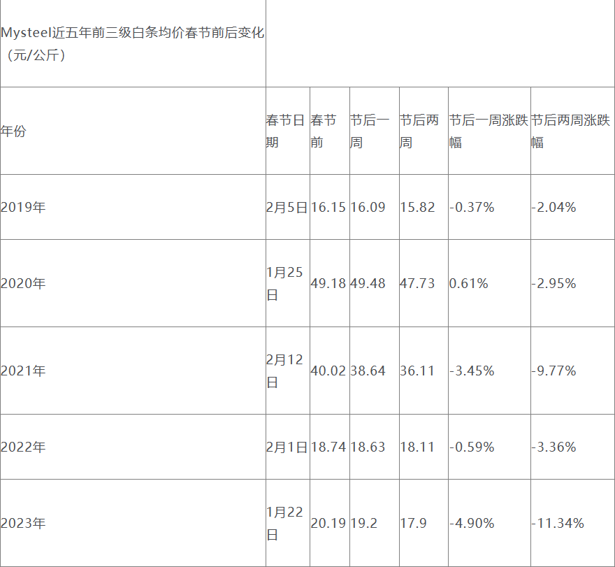 據(jù)Mysteel數(shù)據(jù)顯示,根據(jù)近5年春節(jié)前后豬肉價格變化來看,除2020年節(jié)后第一周,白條價格小幅微漲,其它時候均是下跌。節(jié)后慣性消費(fèi)下滑,導(dǎo)致白條價格下跌。年后基本是屬于我們傳統(tǒng)消費(fèi)淡季,年前備貨較為充足,年后豬肉采購意愿下滑,白條訂單減少,且節(jié)后養(yǎng)殖端出欄節(jié)奏逐步走向正常,導(dǎo)致市場上豬肉供應(yīng)量增加。需求減少和供應(yīng)增加的雙重作用下,節(jié)后白條跌價為主。