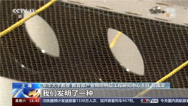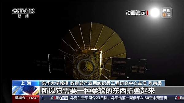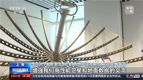 東華大學(xué)教授 教育部產(chǎn)業(yè)用紡織品工程研究中心主任 陳南梁:紡織是一種材料,可能是一種特殊性的材料,比如說航天。航天領(lǐng)域,比如說可展開的天線,它要大型化。鋼材是硬性材料,沒辦法做這么大,運載也沒法運載。所以需要一種柔軟的東西折疊起來,然后到了使用的場景展開,只有紡織品能夠做成這種柔軟的東西。