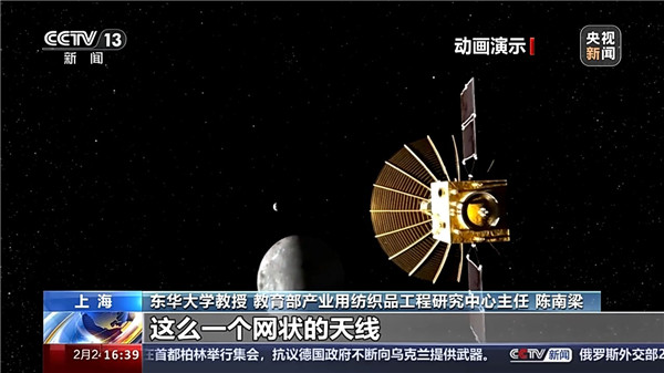 東華大學(xué)教授 教育部產(chǎn)業(yè)用紡織品工程研究中心主任 陳南梁:火箭發(fā)射上去的時候,它是縮在火箭里面。到了軌道以后,它通過展開機構(gòu)把衛(wèi)星反射面慢慢展開成一個網(wǎng)狀天線,所以我們稱為可展開天線。它是柔性的,所以它可以展開,所以我們要通過紡織的編織技術(shù)來形成這么一個布面。