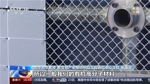 東華大學(xué)教授 教育部產(chǎn)業(yè)用紡織品工程研究中心主任 陳南梁:空間有大量的原子氧存在,氧化能力非常強,所以一般有機高分子材料被氧化得非常厲害,所以要選擇一種抗氧化能力非常高的材料,我們就選擇了無機材料玻璃纖維。