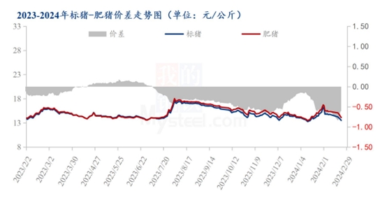 根據(jù)Mysteel農(nóng)產(chǎn)品數(shù)據(jù)顯示,本周全國(guó)標(biāo)肥豬價(jià)差均價(jià)在-0.52元/公斤,較上周價(jià)差縮小0.19,本周標(biāo)肥價(jià)差縮窄。主要原因正月十五之后需求增量,標(biāo)豬價(jià)格持續(xù)反彈,大肥需求逐步減弱,購(gòu)銷(xiāo)清淡,標(biāo)豬價(jià)格走高,標(biāo)肥價(jià)差進(jìn)一步縮小。標(biāo)肥價(jià)差的持續(xù)收窄可能對(duì)市場(chǎng)各方產(chǎn)生一系列的影響和風(fēng)險(xiǎn)。養(yǎng)殖戶(hù)可能面臨豬肉銷(xiāo)售收益減少的壓力,而消費(fèi)者則在選擇購(gòu)買(mǎi)豬肉時(shí)受到更為有限的價(jià)格差異刺激,影響其購(gòu)買(mǎi)決策。此外,整個(gè)產(chǎn)業(yè)鏈中的中間環(huán)節(jié),如屠宰廠(chǎng)和批發(fā)商,也需要對(duì)標(biāo)肥價(jià)差的變化做出相應(yīng)的調(diào)整以適應(yīng)市場(chǎng)的變化。
