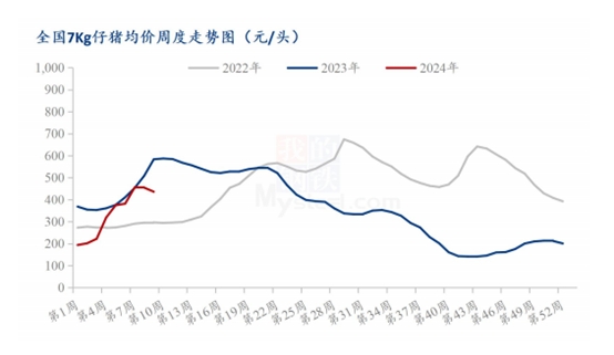 仔豬價(jià)格的變化是市場(chǎng)情緒的先行指標(biāo),仔豬價(jià)格能夠更好的反映產(chǎn)業(yè)端對(duì)未來(lái)豬價(jià)的預(yù)期變動(dòng)。根據(jù)Mysteel農(nóng)產(chǎn)品數(shù)據(jù)顯示:本周全國(guó)7公斤斷奶仔豬均價(jià)為436.19元/頭,較上周報(bào)價(jià)下跌18.57元/頭,環(huán)比下跌4.08%,同比下跌25.22%。周內(nèi)7公斤斷奶仔豬報(bào)價(jià)震蕩下調(diào),跌幅為10-50元/頭,主流市場(chǎng)價(jià)在370-480元/頭。近期仔豬市場(chǎng)詢(xún)盤(pán)氣氛相對(duì)清淡,企業(yè)采購(gòu)訂單有限,業(yè)內(nèi)雖對(duì)后市預(yù)期仍存,但前期仔豬價(jià)格漲幅明顯、當(dāng)下成交量減少,短期行情仍偏弱穩(wěn)。