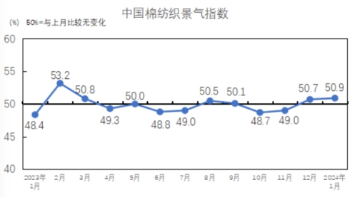 1月份,中國棉紡織景氣指數為50.9%,較12月上升0.2個百分點,景氣指數繼續(xù)提升。國家統(tǒng)計局發(fā)布的2024年1月中國制造業(yè)采購經理指數為49.2%,環(huán)比上升0.2個百分點,制造業(yè)景氣水平有所回升。中國棉紡織景氣指數高于中國制造業(yè)采購經理指數1.7個百分點,處于回升階段。