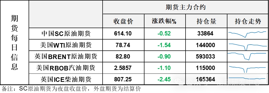 【1】WTI主力原油期貨收跌1.23美元,跌幅1.54%,報(bào)78.74美元/桶;布倫特主力原油期貨收跌0.75美元,跌幅0.9%,報(bào)82.8美元/桶;INE原油期貨收跌0.52%,報(bào)614.1元。