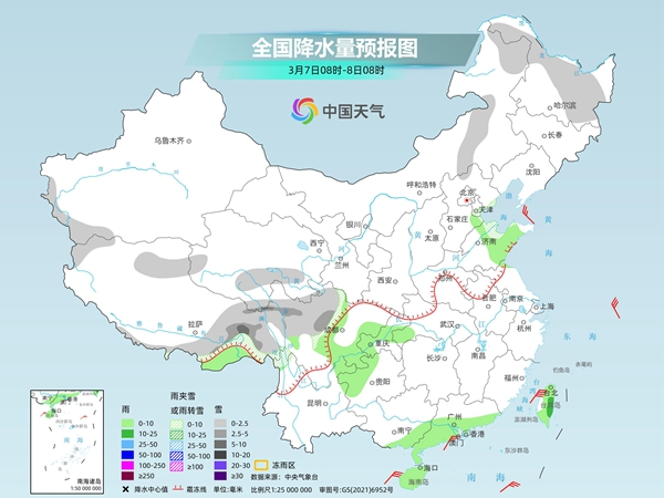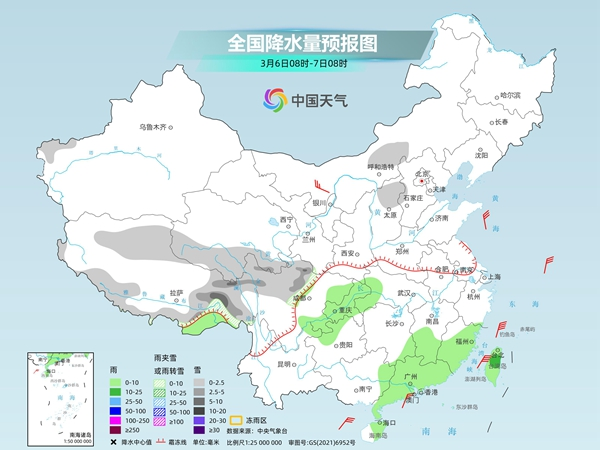 隨著冷空氣繼續(xù)向南推進,今天(3月6日),北方的雨雪將大幅縮減,南方的陰雨范圍也將有所收斂。明天,中東部此輪雨雪過程將趨于結束。不過緊接著,8日至10日,長江以南地區(qū)新一輪陰雨天氣將自西向東發(fā)展起來。氣溫方面,今天,降溫的重心將轉移至江南、華南一帶,尤其是華南地區(qū),氣溫普遍沖高回落,前后冷暖反差較大。